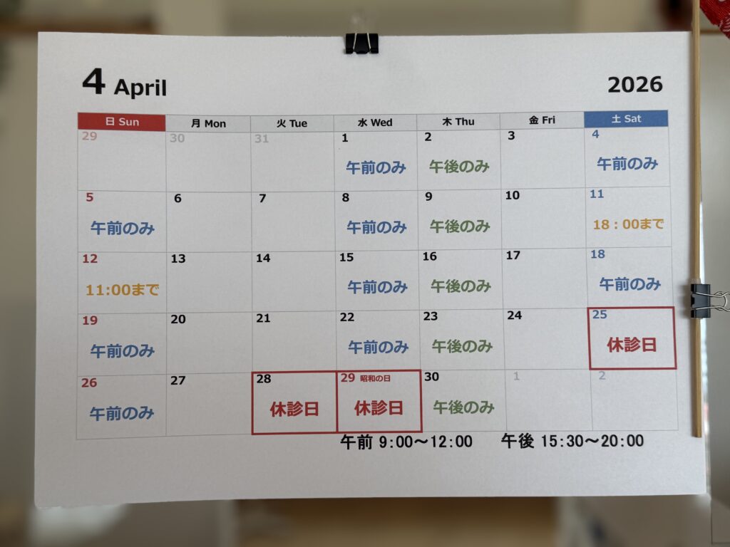 今月はいつも以上に診療時間などが複雑になっておりますが、よろしくお願いします。